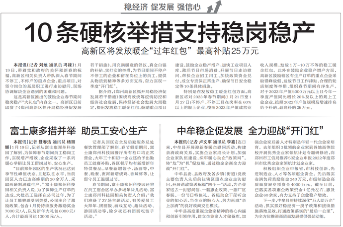 1月19日,记者从富士康郑州科技园了解到,为保障春节期间员工稳岗工作,实现增产增效,企业采取了一系列暖心举措让员工留岗过年,安心生产。(今日《郑州日报》7版)