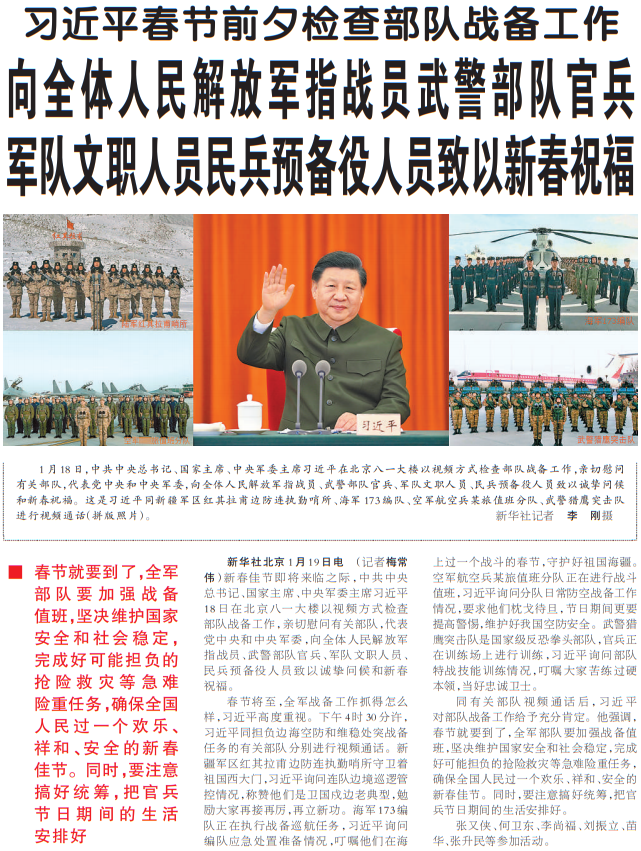 新春佳节即将来临之际,中共中央总书记、国家主席、中央军委主席习近平18日在北京八一大楼以视频方式检查部队战备工作,亲切慰问有关部队,代表党中央和中央军委,向全体人民解放军指战员、武警部队官兵、军队文职人员、民兵预备役人员致以诚挚问候和新春祝福。(今日《人民日报》1版)