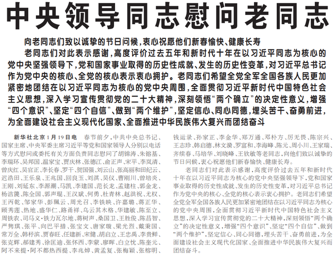 中央领导同志慰问老同志 向老同志们致以诚挚的节日问候,衷心祝愿他们新春愉快、健康长寿