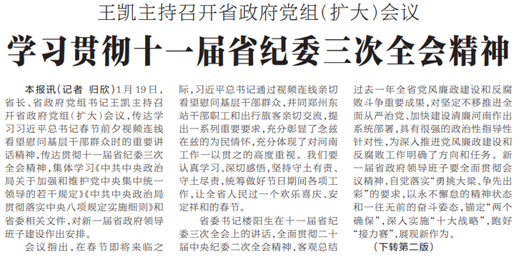 1月19日,省长、省政府党组书记王凯主持召开省政府党组(扩大)会议,传达学习习近平总书记春节前夕视频连线看望慰问基层干部群众时的重要讲话精神,传达贯彻十一届省纪委三次全会精神,集体学习《中共中央政治局关于加强和维护党中央集中统一领导的若干规定》《中共中央政治局贯彻落实中央八项规定实施细则》和省委相关文件,对新一届省政府领导班子建设作出安排。(今日《河南日报》1版、2版)