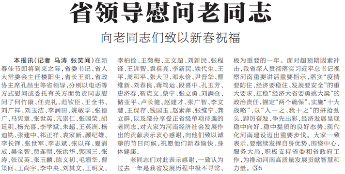 在新春佳节即将到来之际,省委书记、省人大常委会主任楼阳生,省长王凯,省政协主席孔昌生等省领导,分别以电话等方式慰问或委托有关方面负责同志慰问了何竹康、任克礼、范钦臣、王全书、刘广祥、刘玉洁、李润田、姚敏学、张德广、马宪章、张世英、亢崇仁、张国荣、胡廷积、杨光喜、李学斌、朱超、王英洲、杨迪铣、张建中、祁正祥、袁家新、颜纪雄、李长铎、张世军、李志斌、张以祥、夏清成、吴全智、贾连朝、张洪华、郭国三、张涛、张汉英、张玉麟、陈义初、毛增华、曹策问、王尚宇、李中央、刘其文、王明义、李柏拴、王菊梅、王文超、刘新民、张程锋、王训智、袁祖亮、李新民、铁代生、王平、周和平、张大卫、邓永俭、尹晋华、曹维新、刘春良、蒋笃运、段喜中、孔玉芳、史济春、靳克文、蔡宁、张立勇、刘满仓、储亚平、卢长健、赵建才、张广智、李文慧、王保存、钱国玉、赵素萍、张维宁、龚立群,以及部分享受正省级单项待遇的老同志,对大家为河南经济社会发展作出的贡献表示衷心感谢,向他们致以诚挚的节日问候,祝愿他们新春愉快、身体健康。(今日《河南日报》1版)