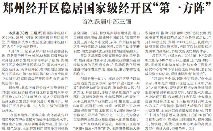 居国家级经开区30强,跃居中部地区国家级经开区前三位,郑州经济技术开发区在全国国家级经开区“大考”中交出新答卷。