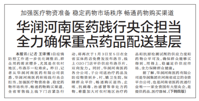 华润河南医药践行央企担当 全力确保重点药品配送基层