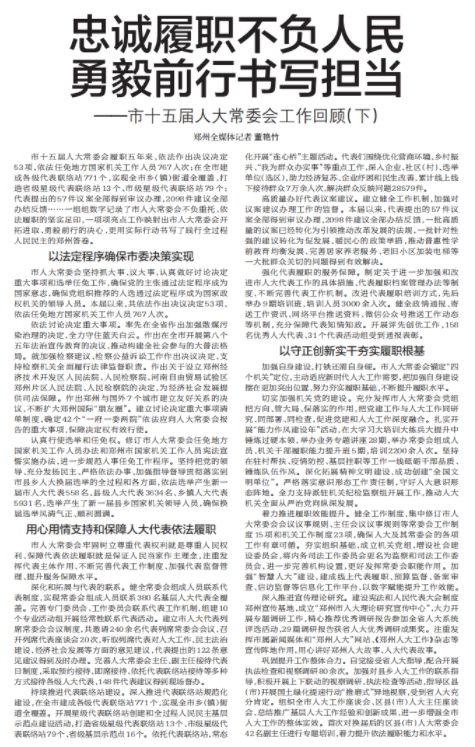 市十五届人大常委会履职五年来,依法作出决议决定53项,依法任免地方国家机关工作人员767人次;在全市建成各级代表联络站771个,实现全市乡(镇)街道全覆盖,打造省级星级代表联络站13个、市级星级代表联络站79个;代表提出的57件议案全部得到审议办理,2098件建议全部办结反馈……(今日《郑州日报》1版、2版)