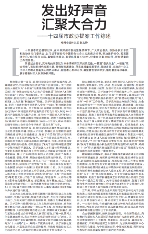 十四届市政协履职五年来,在中共郑州市委的坚强领导下,广大政协委员、政协各参加单位和政协各专门委员会,以习近平新时代中国特色社会主义思想为指导,坚决维护核心,紧紧围绕中心,倾心服务大局,真情服务群众,共提出提案4729件,经审查立案4100件,所有提案均已办理答复。(今日《郑州日报》1版、2版)