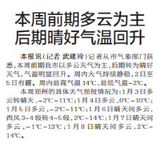记者从市气象部门获悉,本周前期我市以多云天气为主,后期转为晴好天气,气温明显回升。周内大气持续静稳,2日至5日有霾。周内最高气温14℃,最低气温-2℃。(今日《郑州日报》2版)