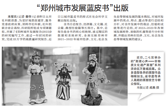 记者昨日从市社科联获悉,为更好地资政建言、服务党委政府决策,郑州市社科联、社科院联合省会高校、科研院所组成专项课题组,开展了《郑州城市发展报告(2022)》的研究编写工作,通过一年时间的研究,完成22万字的高质量研究报告,近日以城市蓝皮书的形式在社会科学文献出版社出版。(今日《郑州日报》2版)