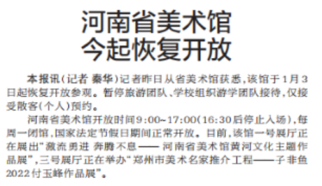 记者昨日从省美术馆获悉,该馆于1月3日起恢复开放参观。暂停旅游团队、学校组织游学团队接待,仅接受散客(个人)预约。(今日《郑州日报》2版)