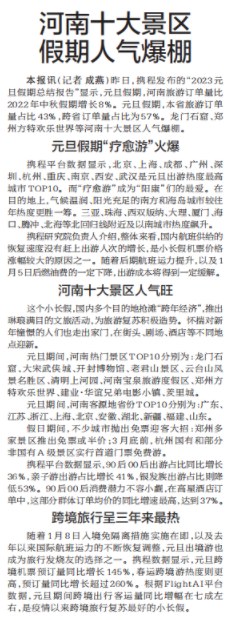 昨日,携程发布的“2023元旦假期总结报告”显示,元旦假期,河南旅游订单量比2022年中秋假期增长8%。元旦假期,本省旅游订单量占比43%,跨省订单量占比为57%。龙门石窟、郑州方特欢乐世界等河南十大景区人气爆棚。(今日《郑州日报》4版)