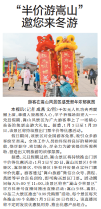 千架无人机功夫秀震撼上演,非遗大鼓激荡人心,学子祈福场面宏大……元旦假期,嵩山风景区为广大游客奉上了一场精心准备的免票出游大礼包。据悉,1月3日至1月20日,该景区将持续推出门票半价等优惠活动。(今日《郑州日报》4版)