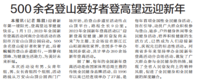 迎着新年第一缕阳光,登高望远享健康快乐。1月1日,2023年全国新年登高活动河南分会场活动在洛阳市万安山山顶公园启动。500余名登山爱好者欢聚于此,沿着蜿蜒的登山步道前行,一路攀向顶峰,为健康生活助力,为美好未来祈福。(今日《郑州日报》4版)