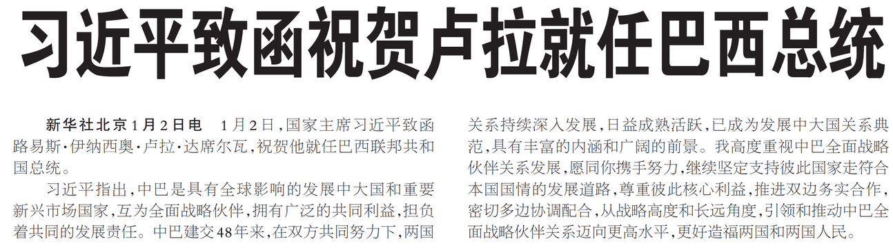 1月2日,国家主席习近平致函路易斯·伊纳西奥·卢拉·达席尔瓦,祝贺他就任巴西联邦共和国总统。(今日《人民日报》1版)