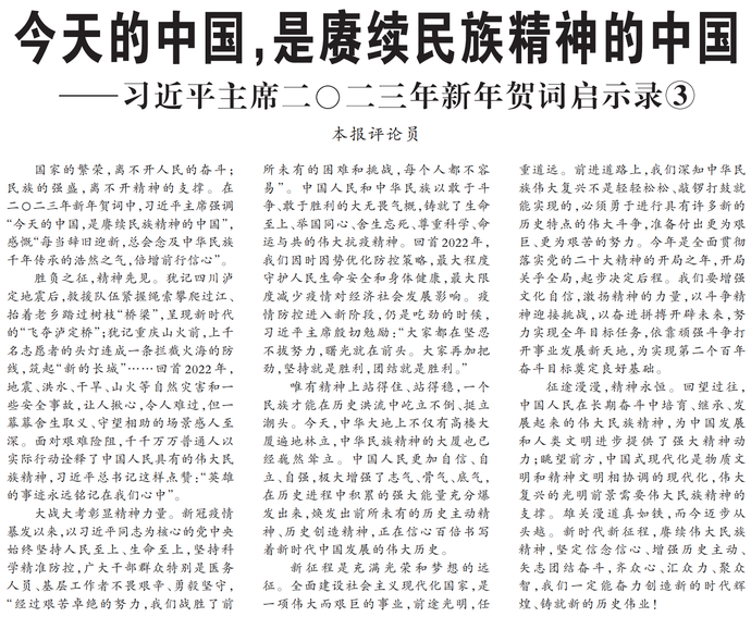 国家的繁荣,离不开人民的奋斗;民族的强盛,离不开精神的支撑。在二〇二三年新年贺词中,习近平主席强调“今天的中国,是赓续民族精神的中国”,感慨“每当辞旧迎新,总会念及中华民族千年传承的浩然之气,倍增前行信心”。(今日《人民日报》1版)