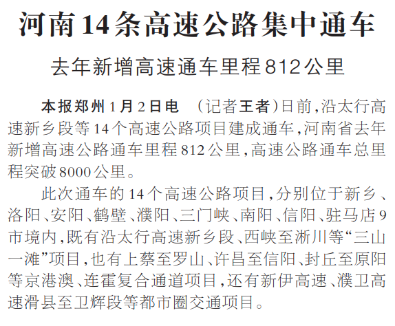 日前,沿太行高速新乡段等14个高速公路项目建成通车,河南省去年新增高速公路通车里程812公里,高速公路通车总里程突破8000公里。(今日《人民日报》10版)