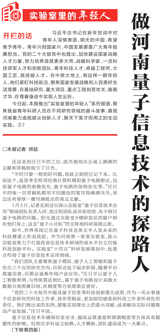 今日起,本报推出“实验室里的年轻人”系列报道,聚焦我省青年科研人员在不同研究领域的奋斗故事,展现河南着力造就拔尖创新人才、聚天下英才而用之的生动实践。