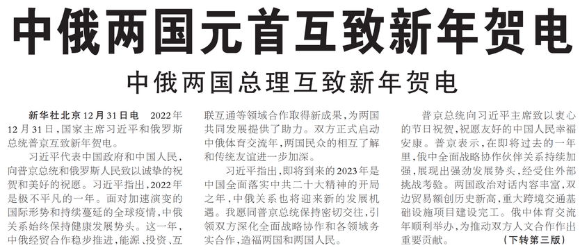 2022年12月31日,国家主席习近平和俄罗斯总统普京互致新年贺电。(今日《人民日报》1版、3版)