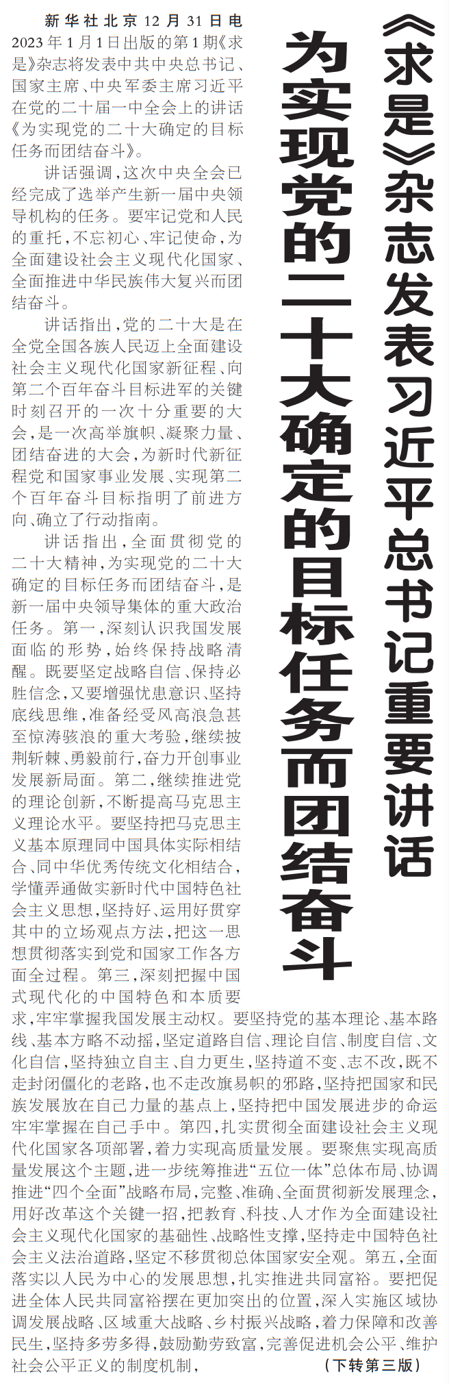 2023年1月1日出版的第1期《求是》杂志将发表中共中央总书记、国家主席、中央军委主席习近平在党的二十届一中全会上的讲话《为实现党的二十大确定的目标任务而团结奋斗》。(今日《人民日报》1版、3版)