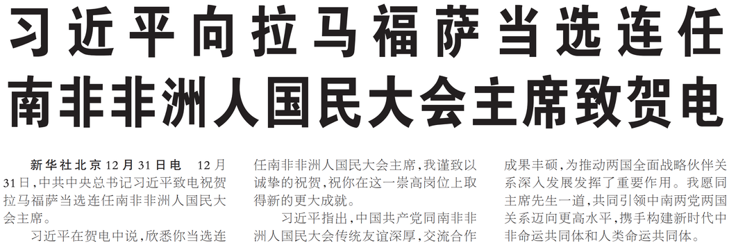 12月31日,中共中央总书记习近平致电祝贺拉马福萨当选连任南非非洲人国民大会主席。(今日《人民日报》1版)