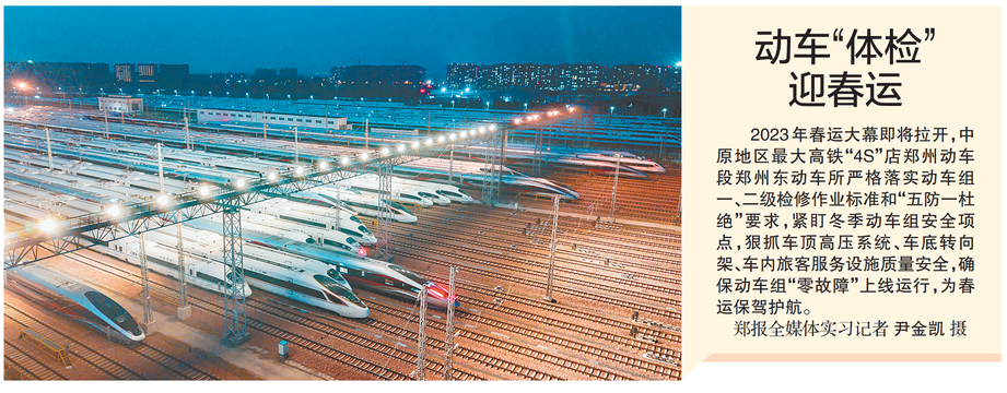 2023年春运大幕即将拉开,中原地区最大高铁“4S”店郑州动车段郑州东动车所严格落实动车组一、二级检修作业标准和“五防一杜绝”要求,紧盯冬季动车组安全项点,狠抓车顶高压系统、车底转向架、车内旅客服务设施质量安全,确保动车组“零故障”上线运行,为春运保驾护航。(今日《郑州日报》1版)