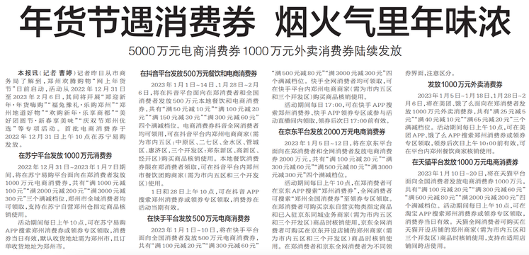 记者昨日从市商务局了解到,郑州欢腾购物“网上年货节”日前启动,活动从2022年12月31日至2023年2月6日,其间将开展“郑迎新年·年货嗨购”“福兔豫礼·乐购郑州”“郑州地道好物”“欢购新年·乐享商都”“美好团圆节·新春享美味”“庆双节郑州优选”等专项活动。首批电商消费券于2022年12月31日上午10点在苏宁易购发放。(今日《郑州日报》2版)