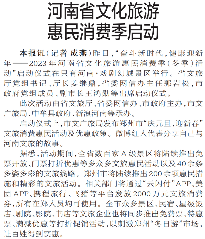 昨日,“奋斗新时代,健康迎新年——2023年河南省文化旅游惠民消费季(冬季)活动”启动仪式在只有河南·戏剧幻城景区举行。省文旅厅党组书记、厅长姜继鼎,省委网信办主任郭岩松,市政府党组成员、副市长王鸿勋等出席启动仪式。(今日《郑州日报》2版)