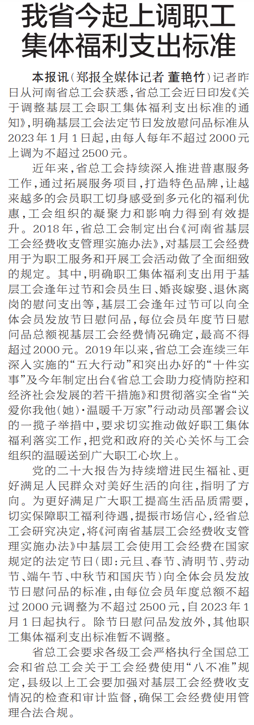 记者昨日从河南省总工会获悉,省总工会近日印发《关于调整基层工会职工集体福利支出标准的通知》,明确基层工会法定节日发放慰问品标准从2023年1月1日起,由每人每年不超过2000元上调为不超过2500元。(今日《郑州日报》2版)