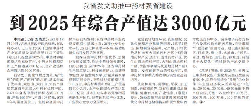 2022年12月30日,记者从省政府网站获悉,省政府办公厅近日印发《关于加快中药材产业高质量发展的意见》,提出到2025年,中药材种植规模达到600万亩,中药材种植和初加工产值达到600亿元、全产业链综合产值达到3000亿元。(今日《河南日报》3版)