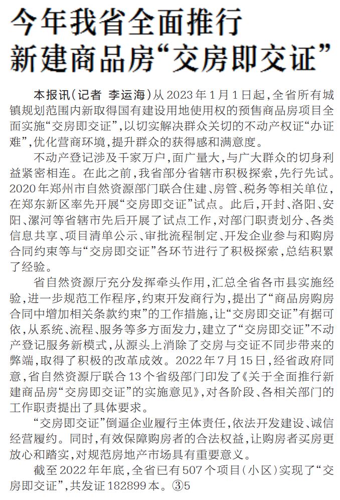 从2023年1月1日起,全省所有城镇规划范围内新取得国有建设用地使用权的预售商品房项目全面实施“交房即交证”,以切实解决群众关切的不动产权证“办证难”,优化营商环境,提升群众的获得感和满意度。(今日《河南日报》4版)