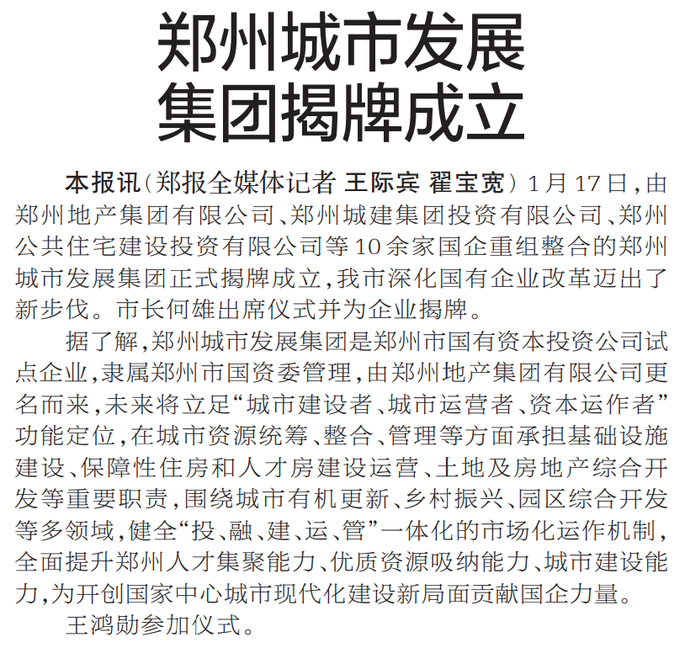 1月17日,由郑州地产集团有限公司、郑州城建集团投资有限公司、郑州公共住宅建设投资有限公司等10余家国企重组整合的郑州城市发展集团正式揭牌成立,我市深化国有企业改革迈出了新步伐。市长何雄出席仪式并为企业揭牌。(今日《郑州日报》1版)