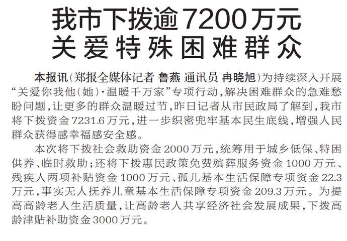 为持续深入开展“关爱你我他(她)·温暖千万家”专项行动,解决困难群众的急难愁盼问题,让更多的群众温暖过节,昨日记者从市民政局了解到,我市将下拨资金7231.6万元,进一步织密兜牢基本民生底线,增强人民群众获得感幸福感安全感。(今日《郑州日报》2版)