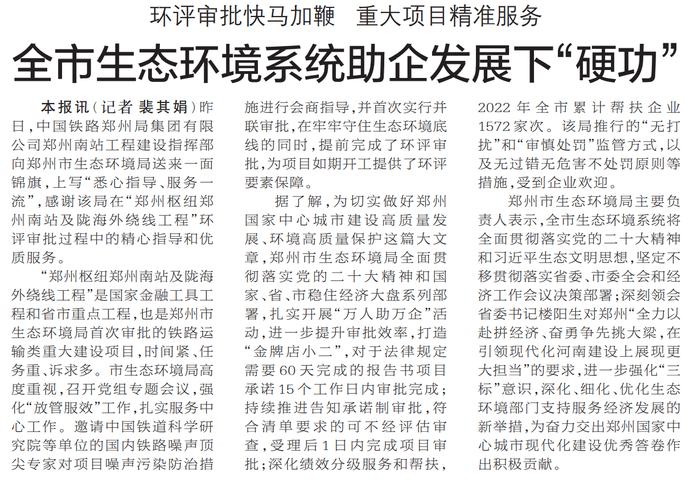 昨日,中国铁路郑州局集团有限公司郑州南站工程建设指挥部向郑州市生态环境局送来一面锦旗,上写“悉心指导、服务一流”,感谢该局在“郑州枢纽郑州南站及陇海外绕线工程”环评审批过程中的精心指导和优质服务。(今日《郑州日报》2版)
