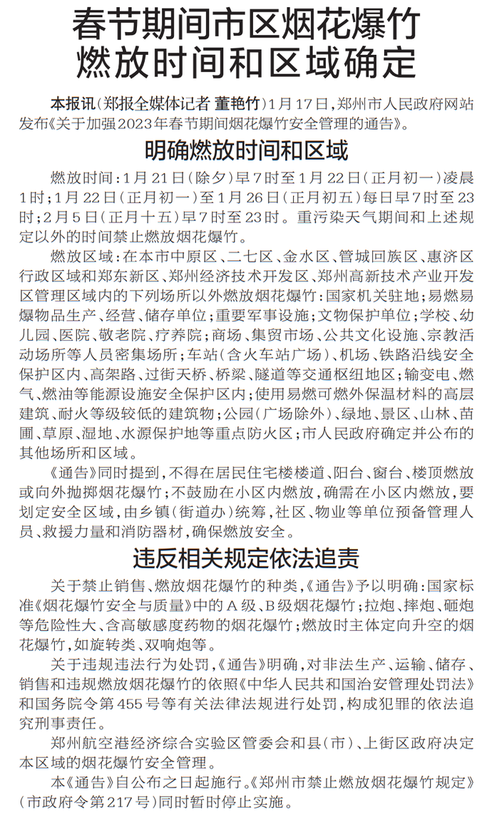 1月17日,郑州市人民政府网站发布《关于加强2023年春节期间烟花爆竹安全管理的通告》。(今日《郑州日报》2版)