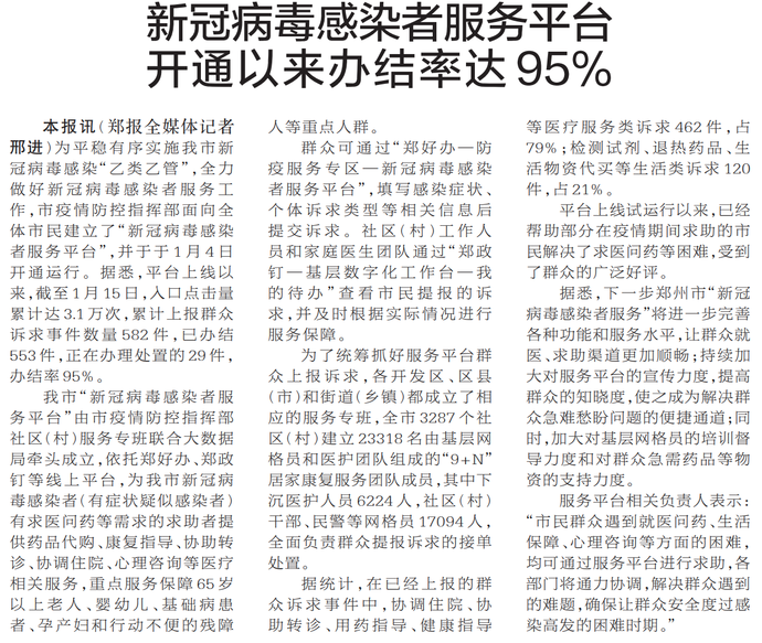 为平稳有序实施我市新冠病毒感染“乙类乙管”,全力做好新冠病毒感染者服务工作,市疫情防控指挥部面向全体市民建立了“新冠病毒感染者服务平台”,并于于1月4日开通运行。据悉,平台上线以来,截至1月15日,入口点击量累计达3.1万次,累计上报群众诉求事件数量582件,已办结553件,正在办理处置的29件,办结率95%。(今日《郑州日报》2版)