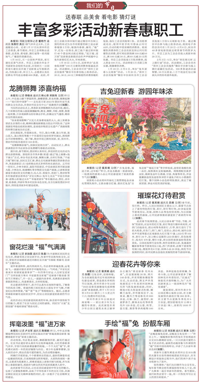 虎去兔来辞旧岁,欢歌笑语迎新春。春节将至,为丰富群众的节日文化生活,以“我们的中国梦”——文化进万家活动为核心,我市相关部门组织众多旅游景区、文化场馆策划推出丰富多彩的文旅活动、文化展演及惠民举措,通过“线上+线下”方式全方位满足市民及游客文旅需求,大力促进假日文旅消费,捧出欢乐喜庆、年味儿十足的兔年春节文化大餐。(今日《郑州日报》8版)