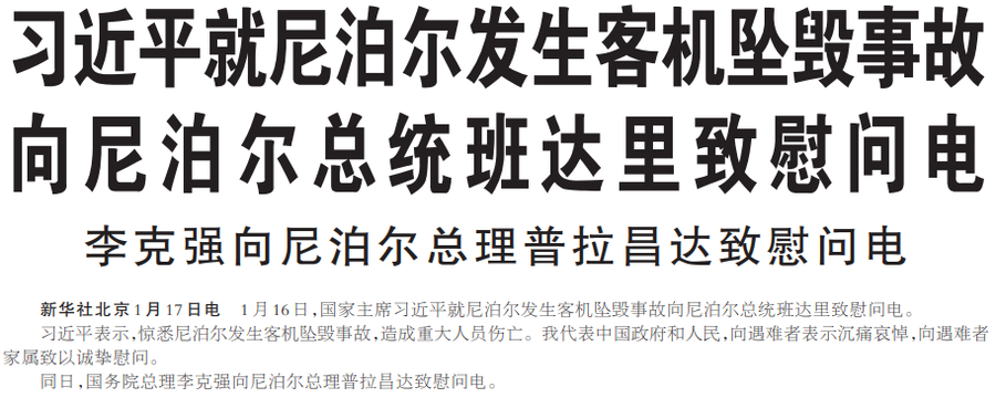 1月16日,国家主席习近平就尼泊尔发生客机坠毁事故向尼泊尔总统班达里致慰问电。(今日《人民日报》1版)