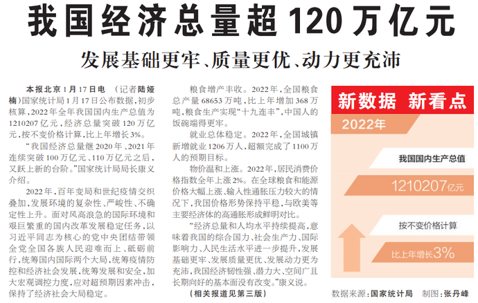 国家统计局1月17日公布数据,初步核算,2022年全年我国国内生产总值为1210207亿元,经济总量突破120万亿元,按不变价格计算,比上年增长3%。(今日《人民日报》1版)