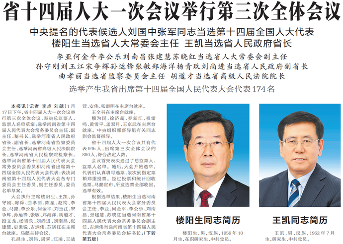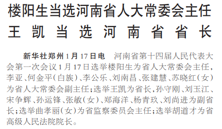 河南省第十四届人民代表大会第一次会议1月17日选举楼阳生为省人大常委会主任,李亚、何金平(白族)、李公乐、刘南昌、张建慧、苏晓红(女)为省人大常委会副主任;选举王凯为省长,孙守刚、刘玉江、宋争辉、孙运锋、张敏(女)、郑海洋、杨青玖、刘尚进为副省长;选举曲孝丽(女)为省监察委员会主任;选举胡道才为省高级人民法院院长。(今日《人民日报》3版)