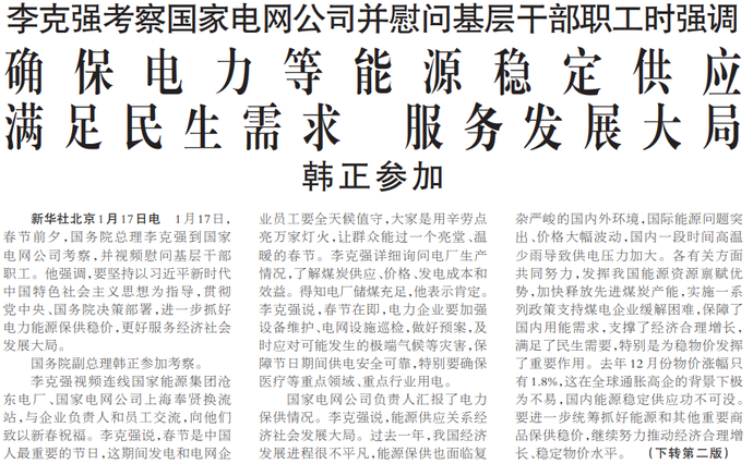 1月17日,春节前夕,国务院总理李克强到国家电网公司考察,并视频慰问基层干部职工。他强调,要坚持以习近平新时代中国特色社会主义思想为指导,贯彻党中央、国务院决策部署,进一步抓好电力能源保供稳价,更好服务经济社会发展大局。(今日《人民日报》1版)
