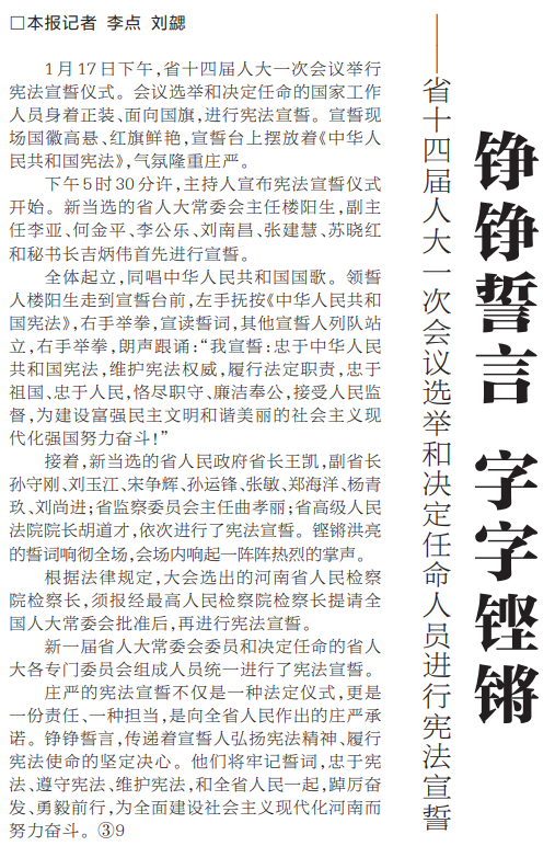 下午5时30分许,主持人宣布宪法宣誓仪式开始。新当选的省人大常委会主任楼阳生,副主任李亚、何金平、李公乐、刘南昌、张建慧、苏晓红和秘书长吉炳伟首先进行宣誓。(今日《河南日报》1版)