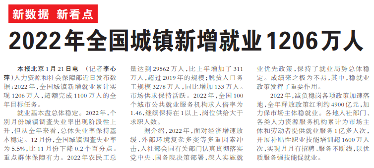 人力资源和社会保障部近日发布数据:2022年,全国城镇新增就业累计实现1206万人,超额完成1100万人的全年目标任务。(今日《人民日报》1版)