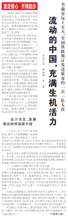 广袤大地,列车飞驰,回家团圆是最暖心的春节礼物。1月7日至21日,节前春运15天,全国铁路预计发送旅客约1.1亿人次,同比增长约28%。旅客们感慨:“流动的中国,浓浓的年味,真好!”(今日《人民日报》1版、3版)