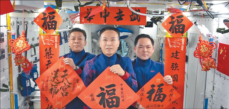 中国空间站迎来建成后首个春节,神舟十五号乘组3名航天员通过视频向祖国和人民送上新春祝福(视频截图)。