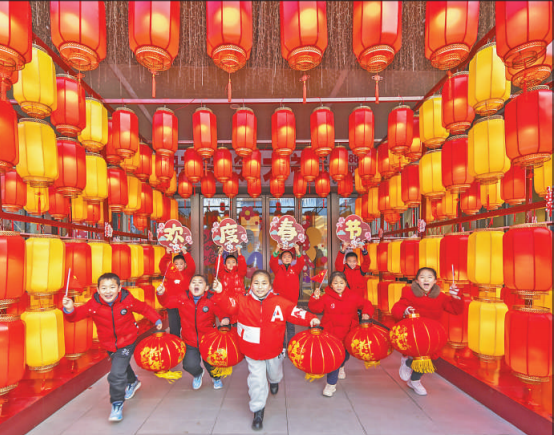 1月21日,在江苏宿迁泗洪县青阳街道吾悦广场上,小朋友在年市长廊里开展“欢乐中国年”主题活动,迎接农历新年。