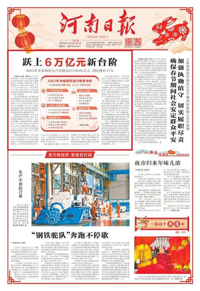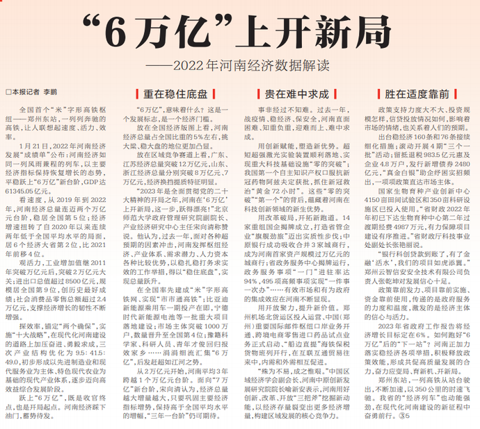 1月21日,2022年河南经济发展“成绩单”公布:河南经济如同一列风雨兼程的列车,以主要经济指标保持恢复增长的态势,平稳跃上“6万亿”新台阶,GDP达61345.05亿元。(今日《河南日报》2版)