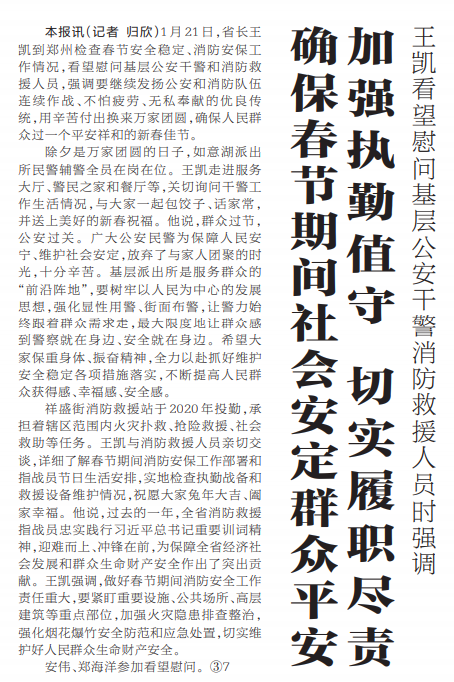 1月21日,省长王凯到郑州检查春节安全稳定、消防安保工作情况,看望慰问基层公安干警和消防救援人员,强调要继续发扬公安和消防队伍连续作战、不怕疲劳、无私奉献的优良传统,用辛苦付出换来万家团圆,确保人民群众过一个平安祥和的新春佳节。(今日《河南日报》1版)