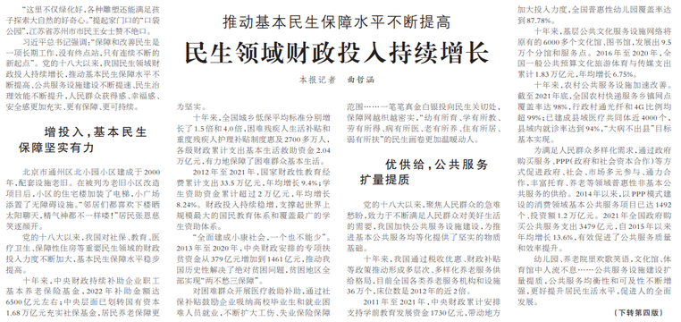 习近平总书记强调:“保障和改善民生是一项长期工作,没有终点站,只有连续不断的新起点”。党的十八大以来,我国民生领域财政投入持续增长,推动基本民生保障水平不断提高、公共服务设施建设不断提速、民生治理效能不断提升,人民群众获得感、幸福感、安全感更加充实、更有保障、更可持续。(今日《人民日报》1版、4版)