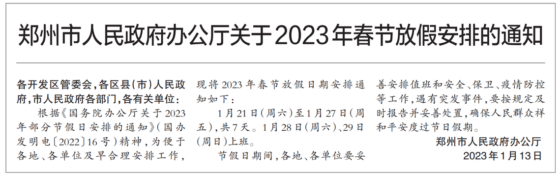 郑州市人民政府办公厅关于2023年春节放假安排的通知