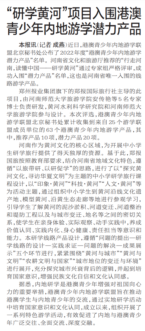 近日,港澳青少年内地游学联盟北京秘书处公布了2022年度“港澳青少年内地游学潜力产品”名单。河南省文化和旅游厅推荐的“行走河南,读懂中国——研学黄河”通过专家组严格评审,成功入围“潜力产品”名单,这也是河南省唯一入围的线路游学产品。(今日《郑州日报》2版)
