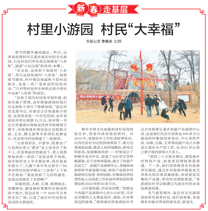 春节的脚步越来越近。昨日,记者来到登封市石道乡赵庄村的文化游园,只见村民们争先恐后地乘坐“八卦秋”,感受“八仙过海”的风采。(今日《郑州日报》2版)