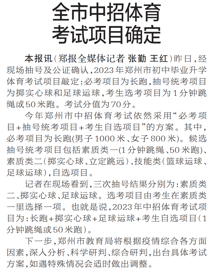 昨日,经现场抽号及公证确认,2023年郑州市初中毕业升学体育考试项目敲定:必考项目为长跑,抽号统考项目为掷实心球和足球运球,考生选考项目为1分钟跳绳或50米跑。考试分值为70分。(今日《郑州日报》2版)